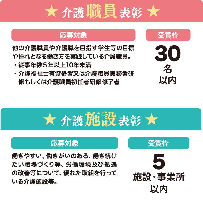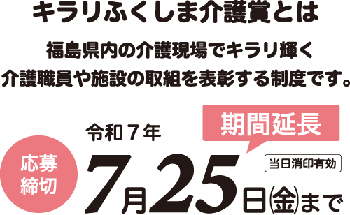 ※受賞された介護職員・介護施設等は「キラリふくしま介護賞受賞者(施設)」として、福島県の介護をPRする活動にご参加いただく場合があります。