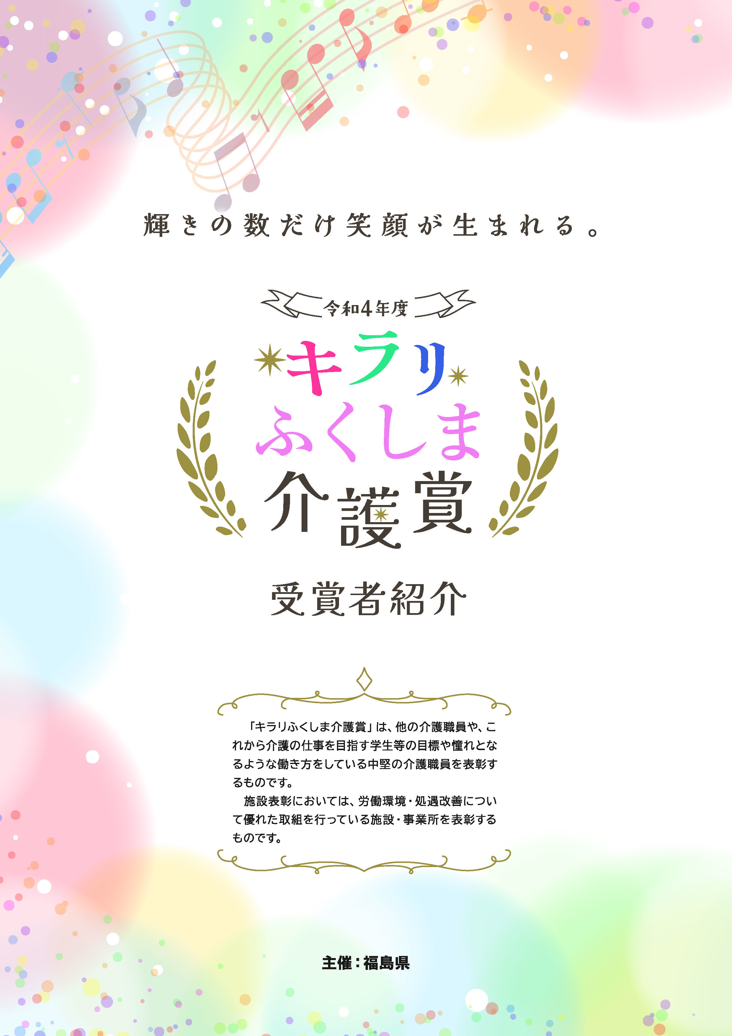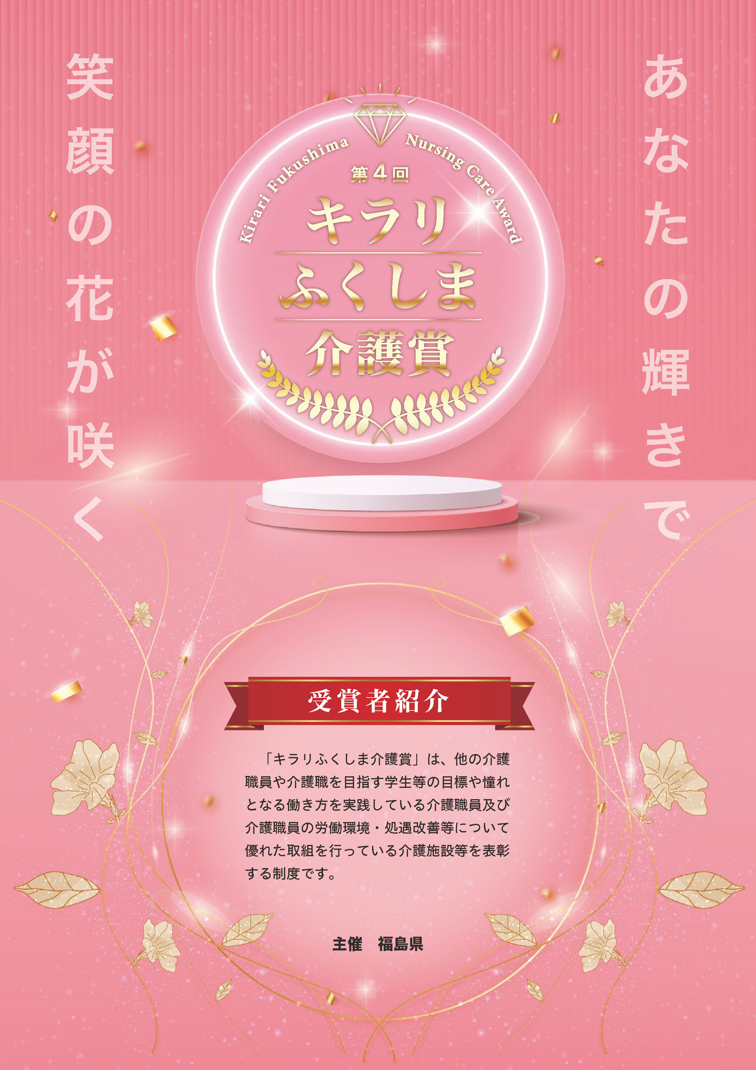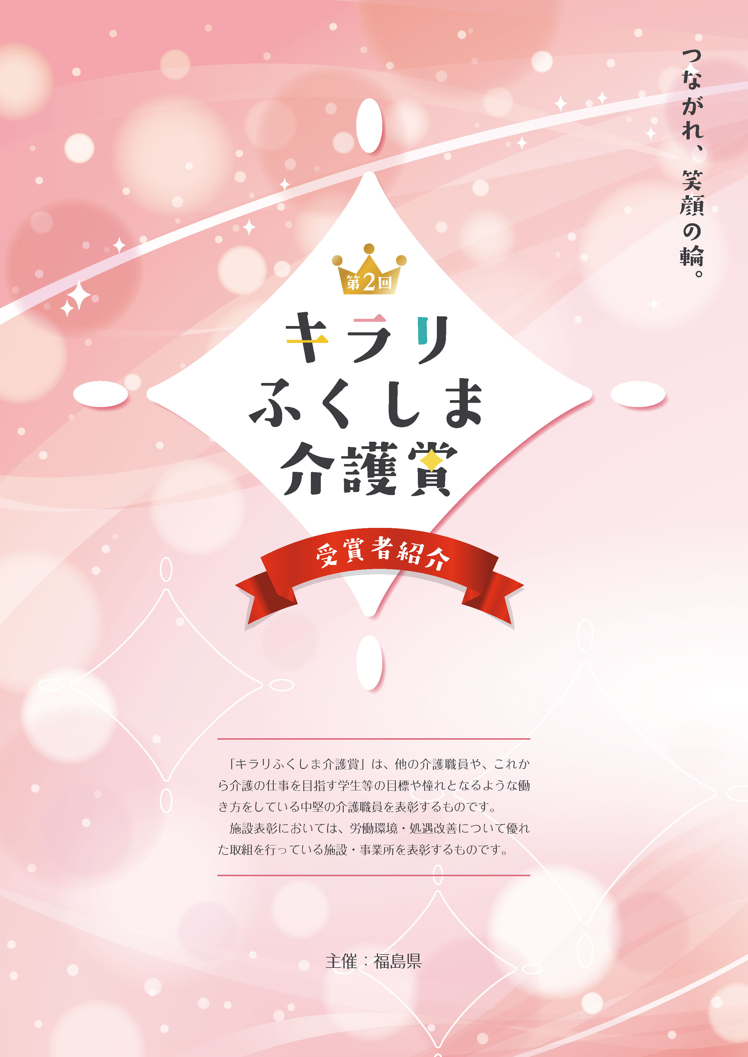 ※受賞された介護職員・介護施設等は「キラリふくしま介護賞受賞者(施設)」として、福島県の介護をPRする活動にご参加いただく場合があります。